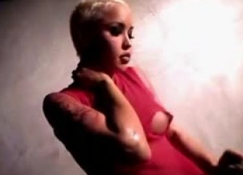 Fræk blond tatoo dulle med gode patter stripper op af en mur