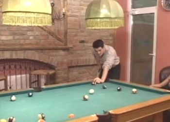 Fræk storbarmet teenage blondine får pik af to mænd på et pool bord